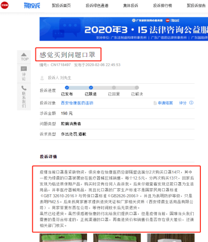 另一名消费者于2月6日在聚投诉平台发帖称,“疫情期间在怡康医药总部隔壁店面分两次购买了一款名为‘绿晨防尘口罩’的产品13只(12.5元/只),该产品被摆放在医疗器械区域销售,购买时无人告知该产品临近质保期。随后发现这款口罩为生活用品,并非医疗器械用品,并且未标明防护等级,只是标明PM2.5专业防护。