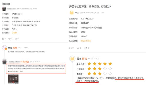 中国网财经记者注意到,消费者对“倩狐”的投诉问题多为“产品与宣传不符”、“欺骗消费者”、“诱导消费”等。