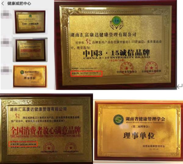 倩狐工作人员向记者介绍减肥产品的同时,发送给记者公司获得上述证书的照片,称“公司是大型减肥企业,不存在减不下来,可以放心使用”,但是,记者发现,湖南汇富康达健康管理有限公司获得的“中国3·15诚信品牌”有效日期为2017年8月至2019年8月。