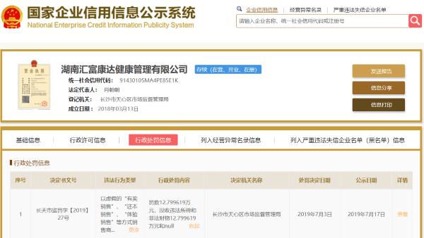 国家企业信用信息公示系统显示,湖南汇富康达公司2019年因涉及违法行为被罚款:2019年7月3日,湖南汇富康达公司因以虚假的“有奖销售”、“还本销售”、“体验销售”等方式销售商品或者服务,被长沙市天心区市场监督管理局罚款约12.8万元。