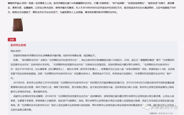 圈钱跑路的还有北京颐好合作社彭州市分社,该分社为“盛嘉颐好集团”旗下“北京颐好科技发展专业合作社”在彭州的分支机构。北京颐好科技发展专业合作社注册地在北京海淀区,实际运营地在内蒙古鄂尔多斯市,该合作社在全国各地成立了不少分支机构,鼓动农民投资参与,据成都市公安局反馈,北京颐好科技发展专业合作社因涉嫌组织、领导传销已被内蒙古鄂尔多斯市公安局东胜分局立案侦查,公司法人、主要骨干已被抓获,相关资产已被查封、冻结。