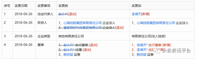 口说无凭,心海集团和颐好合作社进行合作,到底有没有什么实质性的证据呢?为此我们通过进一步地调查,发现了有一家名为盛嘉心海科技发展有限公司的企业,在该公司的工商信息变更记录中,我们可以清楚地看到这家公司的确是盛嘉颐好集团与心海集团合作的产物,鲍世超还在这家公司担任了监事,另外值得注意的是,2018年6月,当颐好合作社东窗事发之时,盛嘉颐好集团的实控人赵小兵退出该公司法定代表人的位置,而接替她的则是一个叫李德天的人。没错,这个李德天就是北京心海永康保健食品有限公司的李德天,就是上文中已被法院出示了限制高消费令的李德天。