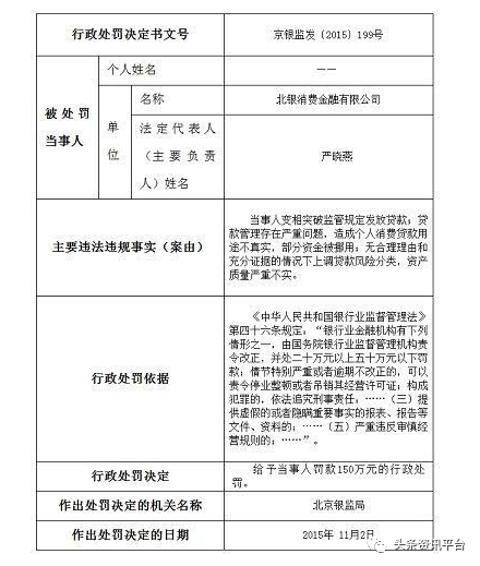 事实上,近些年来,北银消费公司也曾多次遭到过银监局处罚,2015年11月2日,北京银监局对北银消费金融开出了150万元的罚单,为当年消费金融的最高额度罚款。理由是变相突破监管规定发放贷款,贷款管理存在严重问题,造成个人消费贷款用途不真实、部分资金被挪用。无合理理由和充分证据的情况下上调贷款风险分类,资产质量严重不实。