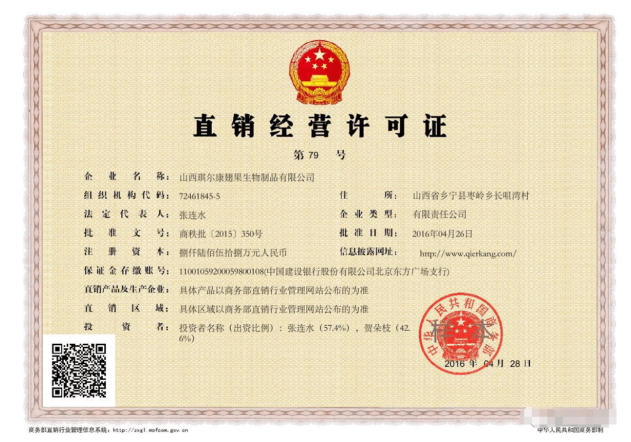 在商务部官网上查询到琪尔康直销区域为山西省,产品一类一种,在直销产品中并没有伊妮莎莉的相关信息,