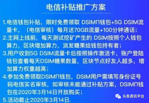 再说天天乐讯,天天乐讯被提及与西姆币有关,最早是在2020年年初。据一位昵称为“布道者”的用户发布在“说坑网”上的一篇文章显示:2019年12月31日起,通过天天乐讯渠道办理free会员卡套餐的用户,经过用户口碑宣传及微信群推广进入西姆页面,即可每天免费自动挖取西姆币(DSIM) ,待西姆币上线交易所后,可流通交易。在四个多月过去后的当下,推广人员就算是否认了与中国电信的联系,也没有否认天天乐讯与西姆币的关联。