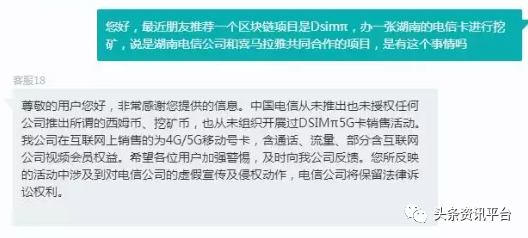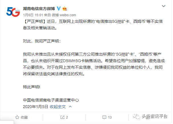2019年末,该项目正式推出后,社会各界一片哗然。先说中国电信方面的反映,2020年1月5日,湖南电信官方微博发布消息称:“近日,互联网上出现所谓的电信推出5G挖矿卡、西姆币等不实信息及相关营销活动。对此,湖南电信严正声明:我司从未推出且从未授权任何第三方公司推出所谓的5G 挖矿卡、西姆币等产品,也从未组织开展过DSIMπ5G卡销售活动。希望各位用户加强警惕,避免造成不必要损失。”