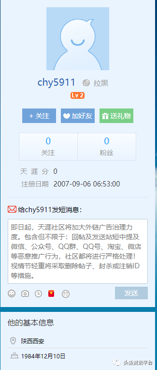而通过对相关关键词“chy5911”进行搜索后,我们发现有一个天涯社区的账号,昵称就是chy5911,个人信息载明:此人为陕西西安人,生日为1984年12月10日。在2011年前后,此人在天涯社区多次发布关于“西安人摆地摊”的网站链接(网站名为地摊网),目前,该链接已无法访问。