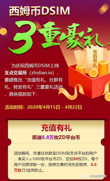 4月10日,DSIM提币功能正式开放,现有多比,联邦,支点等交易所已经收录DSIM,且支点交易所还与西姆币合作,推出了一些刺激网友加入的活动政策。