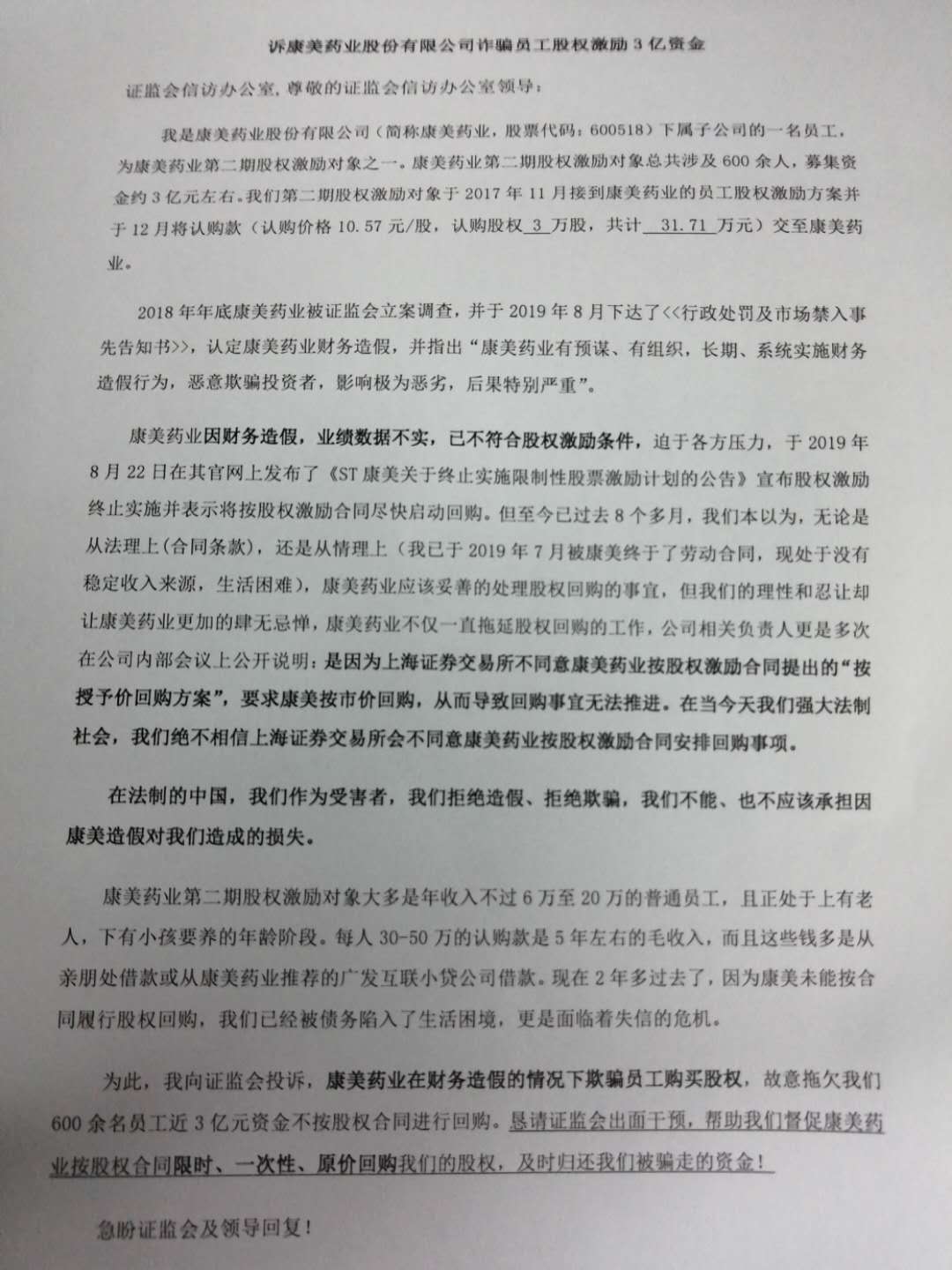 根据曾荣提供的信息,该激励计划授予的对象多为年收入6万到20万元的普通员工,支付认购款耗费了员工的大部分甚至是全部积蓄。因ST康美未及时回购股票,给大部分授予对象的生活已造成较大的困扰。