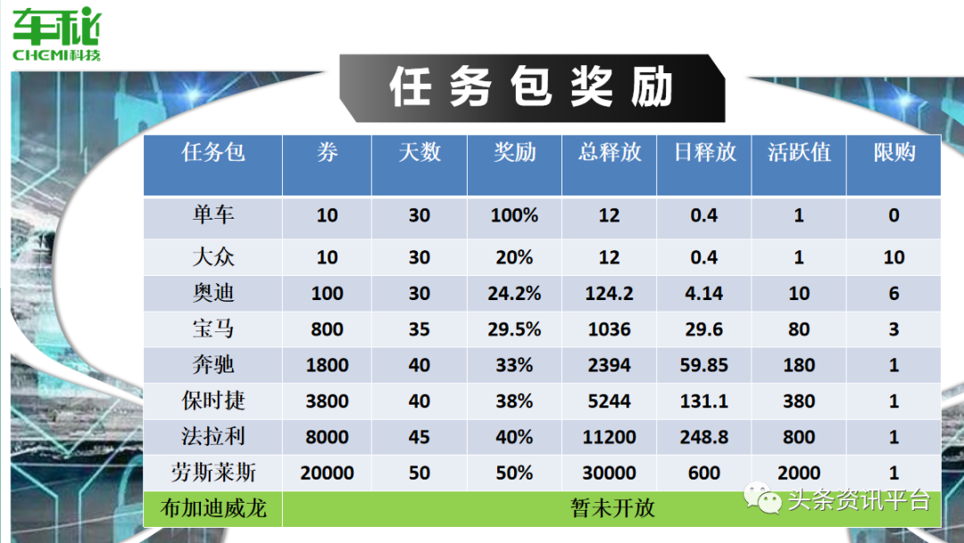一个账户最多同时运行大众任务包 10 个(每个任务包活跃值1),奥迪任务包6个(每个任务包活跃值10);宝马任务包3个(每个任务包活跃值80);奔驰任务包2个(每个任务包活跃值180);保时捷任务包1个(活跃值380);法拉利任务包1个(活跃值800);劳斯莱斯任务包1个(活跃值2000)。而活跃值为团队成员拥有任务包的价值的十分之一,也就是说,当团队成员购买劳斯莱斯任务包(价值20000卷)后,团队长的团队活跃值就增加2000。