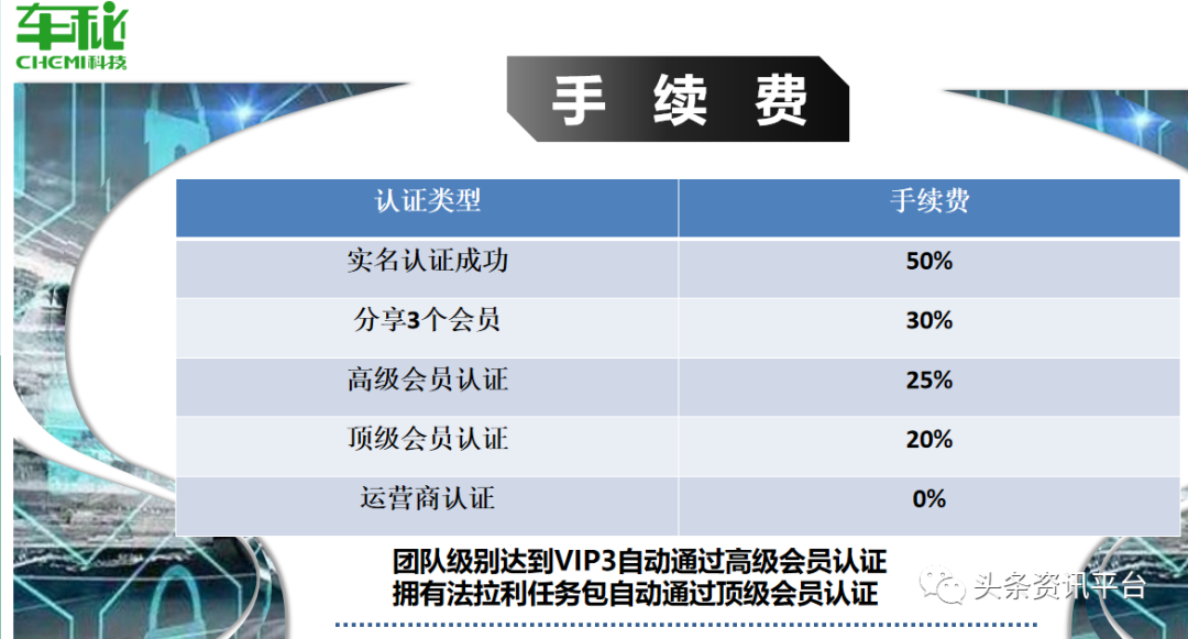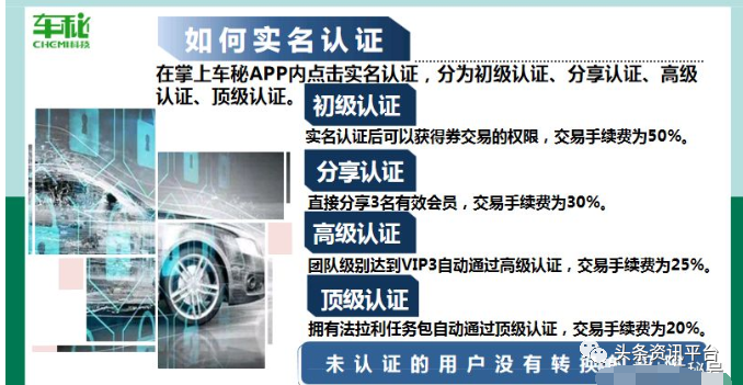 那么,认证等级分为几个等级?手续费怎么计算?具体来讲,用户级别越高,交易手续费越低,级别基本上分为初级认证,中级认证,高级认证,顶级认证。初级认证:实名认证后获得券交易的权限,交易手续费为50%;中级认证:直推分享 3 名有效会员,交易手续费30%;高级认证:团队级别达到 VIP3 自动通过高级认证,交易手续费为25%;顶级认证:拥有法拉利任务包自动通过顶级认证,交易手续费20%。