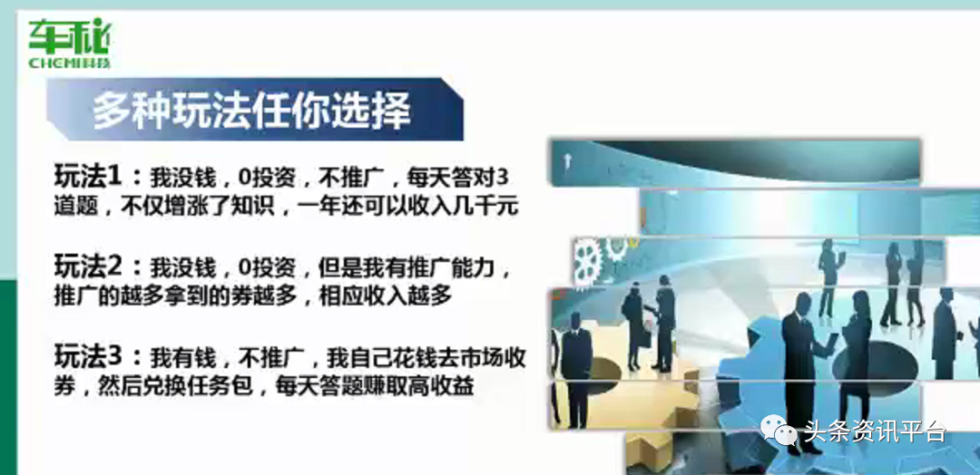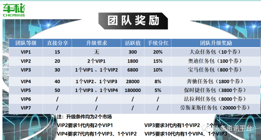 据宣传资料推测,“假如一年后的券是30元/个,你就赚了4800元,一家四口都注册上,就可以赚13600元;要是你一开始就把券卖掉了,那你就只能下车,想继续玩就得自己出钱买10个券去兑换一个初级券。你拥有一个邀请二维码,可以去推广赚钱。上VIP达人每天还可享受全国流水交易分红,建立管道收益。平台以后会对接汽车维护、加油站和商场等,你底下团队有交易,你就有提成。比如:他今天在某停车场要缴费20元,按1%算,你得2角;他换个轮胎花去400元,你得4元,团队越大,你每天收入越多。”
