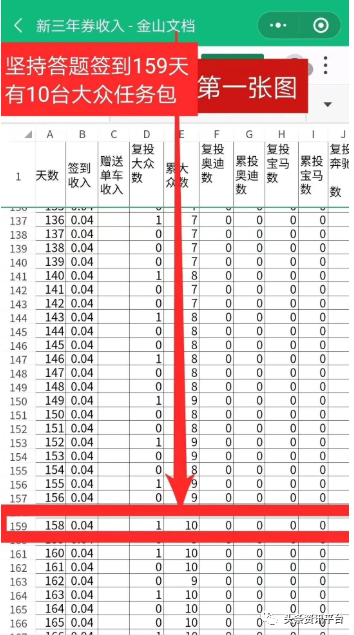 如上图所示,不投钱的话,要连续答题159天才有10个大众任务包,连续答题825才能有一个劳斯莱斯任务包。任务包相当于一个老母鸡,每天下蛋,其实,说任务包是老母鸡也好,是矿机也好,反正都是每天答题成功后,任务包就会释放出来0.4个券(单车和大众),多攒卷可以换更高级的任务包。