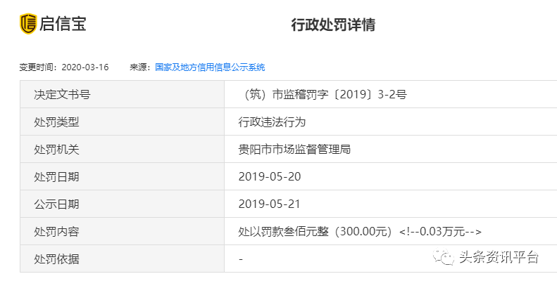 2019年5月下旬,贵州车秘科技有限公司又因行政违法行为遭到了贵阳市市场监督管理局的罚款。