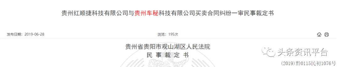 同样在这段时期,据中国裁判文书网显示,贵州红顺捷科技有限公司以“买卖合同纠纷”为由将贵州车秘科技有限公司告上法庭,但原、被告收到开庭传票后,均未到庭参加诉讼。法院联系原、被告双方当事人后,双方表示已履行完毕,已无诉讼必要,最终,贵州红顺捷科技有限公司选择了撤诉。