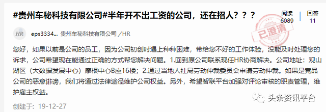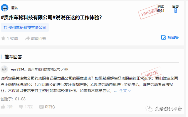 1月8日,在智联招聘旗下职场社区中,车秘公司官方疑似对相关问题进行了回应,并表示这些员工没有职业素养,是在落井下石:“请问您是关注我公司的离职者还是竞品公司的恶意诽谤?如果希望解决好离职前的正常诉求,我们建议您两点正确的解决途径:1.回到原公司进行友好协商解决;2.通过劳动仲裁进行劳动申诉,维护劳动者合法权益,不仅可以要求支付工资还能获得经济补偿。如果都不愿意尝试,是否考虑是自身的原因?前期招聘及员工管理的问题,造成入职者与岗位职责不匹配,无法胜任;员工是公司价值的创造者,公司陷入困境还继续落井下石,请问该员工的职业素养在哪里?”