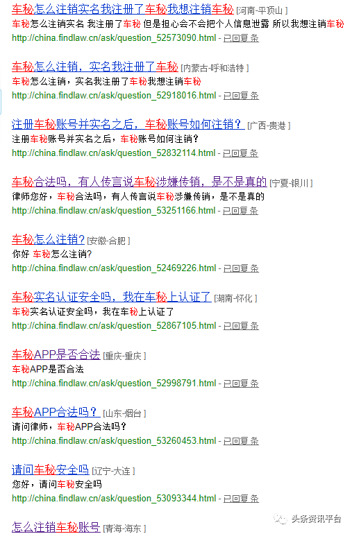 近期,在找法网上,资询车秘APP的合法性以及想要注销车秘账号的用户也越来越多。