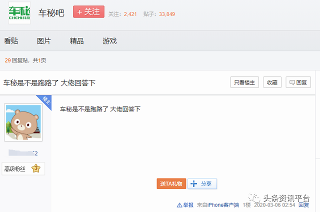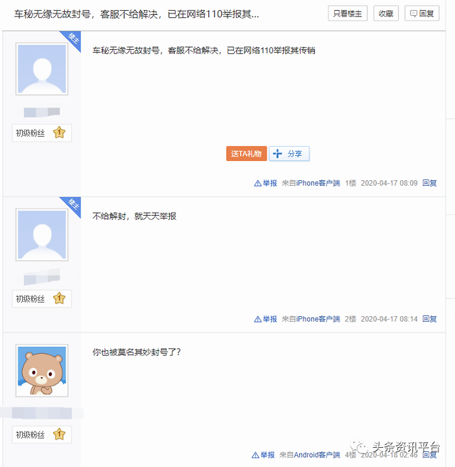 4月17日,又有网友在贴吧反映“车秘无缘无故封号,客服不给解决,已在网络110举报其传销”,从回复情况来看,出现这种状况的参与者不止一人。