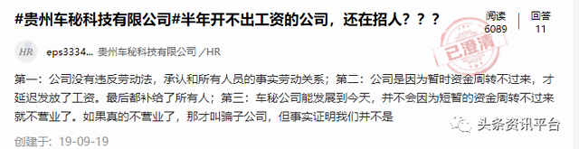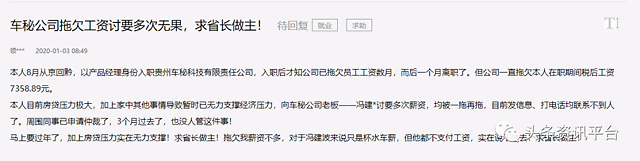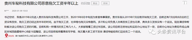 2020年1月3日,有网友在领导留言板上留言,投诉车秘公司拖欠工资:“本人8月从京回黔,以产品经理身份入职贵州车秘科技有限责任公司,入职后才知公司已拖欠员工工资数月,而后一个月离职了。但公司一直拖欠本人在职期间税后工资7358.89元。本人目前房贷压力极大,加上家中其他事情导致暂时已无力支撑经济压力,向车秘公司老板讨要多次薪资,均被一拖再拖,目前发信息、打电话均联系不到人了。周围同事已申请仲裁了,3个月过去了,也没人管这件事。”