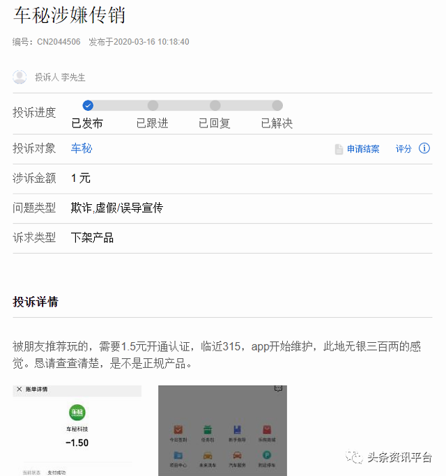3月16日,网友李先生在聚投诉平台上投诉“车秘涉嫌传销”,并称在“3.15”前车秘突然维护。