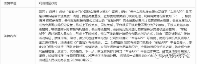 3月27日,面对网友在群众直通交流台上关于车秘是否涉嫌传销的咨询,贵州观山湖区政府回复如下: