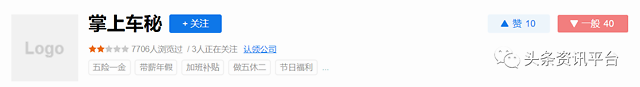 目前,在职友集上,“掌上车秘”的评价是两颗星,“点赞”数为10,用户评价“一般”的评价次数为40。
