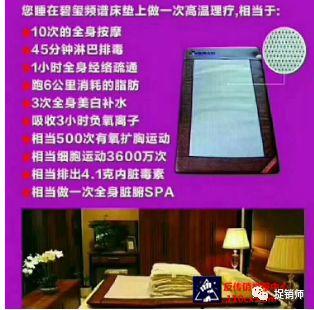 号称五高人群福音,60分钟见效的炎帝碧玺频谱电热床垫。用途广泛,见效快,虽然在商务部直销管理系统没有备案,但是卖你3万块应该不算高吧?