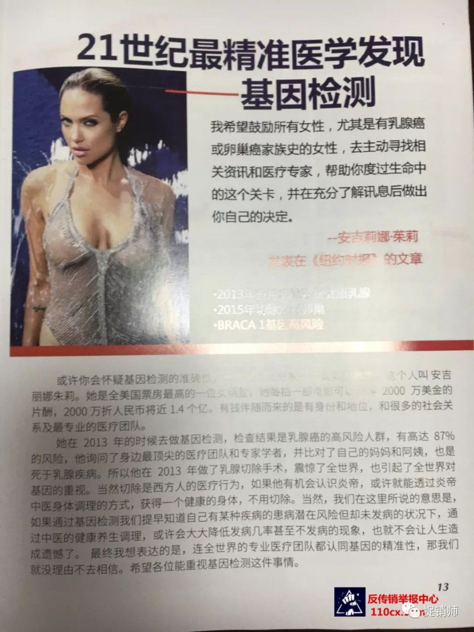 朱莉在2013年通过基因检测为乳腺癌易感人群,后切除乳房,此举使基因检测走下神坛,为世人所熟知。这是公认的事实。