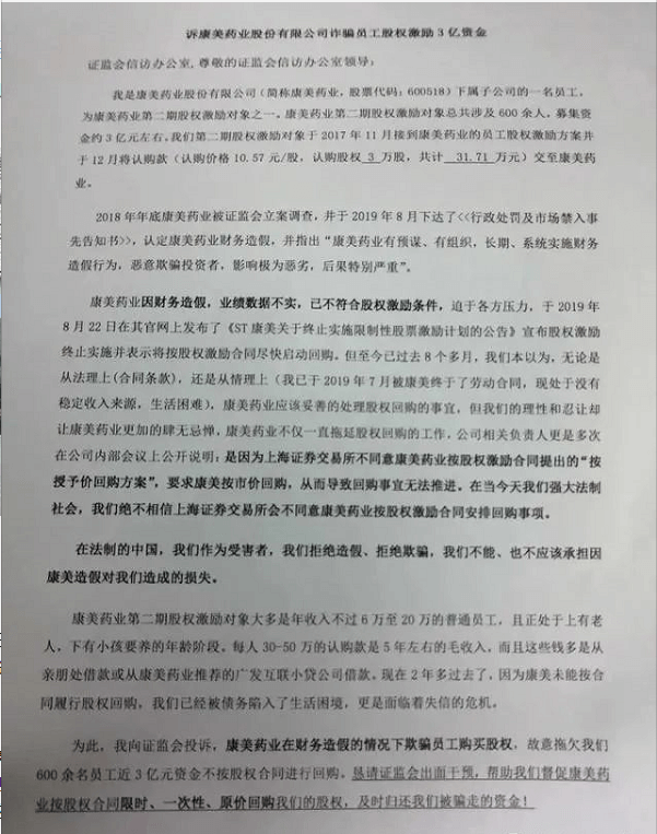根据曾荣提供的信息,该激励计划授予的对象多为年收入6万到20万元的普通员工,支付认购款耗费了员工的大部分甚至是全部积蓄。因ST康美未及时回购股票,给大部分授予对象的生活已造成较大的困扰。