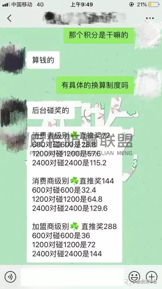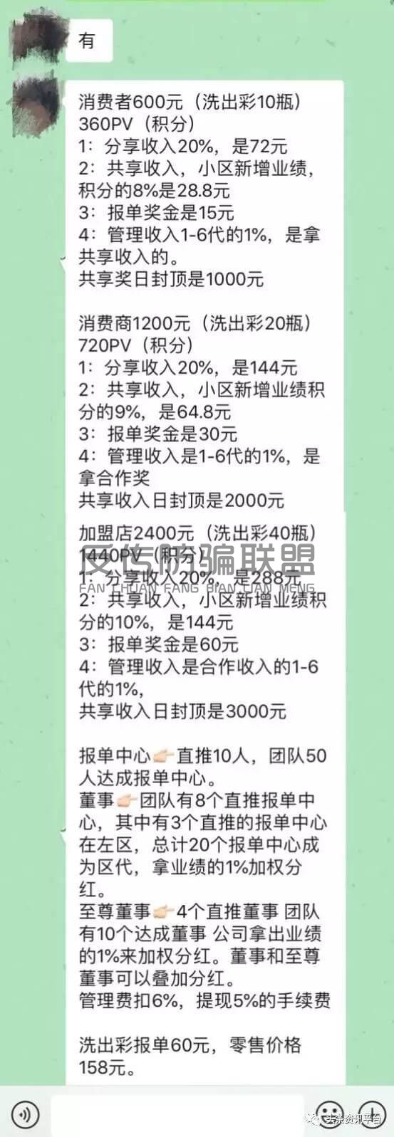 从上图中可以看出,代理级别越高,拿到的奖金分红也就越多。从经销商吴某的介绍来看,爱暄堂洗出彩的奖金种类很多,并且有分享奖、共享奖等,代理获得的积分将采取后台对碰双轨制政策。
