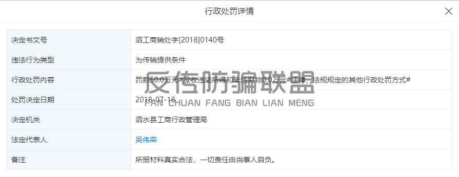 同时,反传防骗联盟通过天眼查查询得知,永春堂在2018年因“为传销提供条件”被泗水县工商行政管理局罚款50万元。