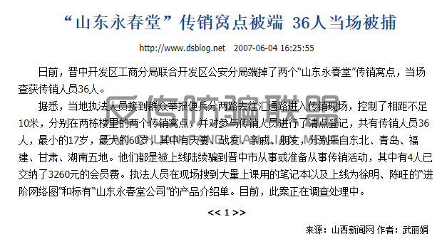 据山西新闻网报道,在2007年,山东永春堂的两个传销窝点被晋中开发区工商分局联合开发区公安分局一锅端,当场查获传销人员36人,他们都是被上线陆续骗到晋中市从事或准备从事传销活动,其中有4人已交纳了3260元的会员费。执法人员在现场搜到大量上课用的笔记本以及上线为徐明、陈旺的“进阶网络图”和标有“山东永春堂公司”的产品介绍单。