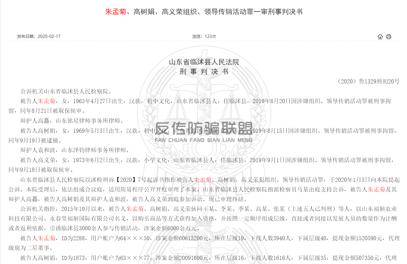 近日,反传防骗联盟在中国裁判文书网上注意到了一起《朱孟菊、高树娟、高义组织领导传销活动罪一审刑事判决书》。