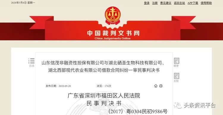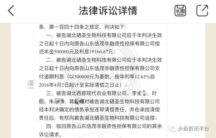 据《山东信茂非融资性担保有限公司与湖北硒圣生物科技有限公司、湖北西部现代农业有限公司借款合同纠纷一审民事判决书》显示,2015年11月29日,被告硒圣生物公司在深圳市合拍在线互联网金融服务有限公司的合拍在线平台上向出借人借款50万元,期限为4个月,同时被告西部现代农业公司、李某某、叶某、朱某某、蒋某某为硒圣生物公司的借款做担保,承担连带责任保证。