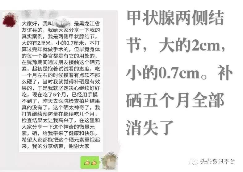 来自黑龙江省的尹女士,患有两侧甲状腺结节,大的有2厘米,小的都有0.7厘米,一直在犹豫要不要做手术。后来抱着试试看的心态服用了产品,一个月左右的时间结节就变软了,于是继续吃了五个月,当时已经用手摸不到结节的存在,再后来去医院拍片检查时,甲状腺结节已经全部消失。
