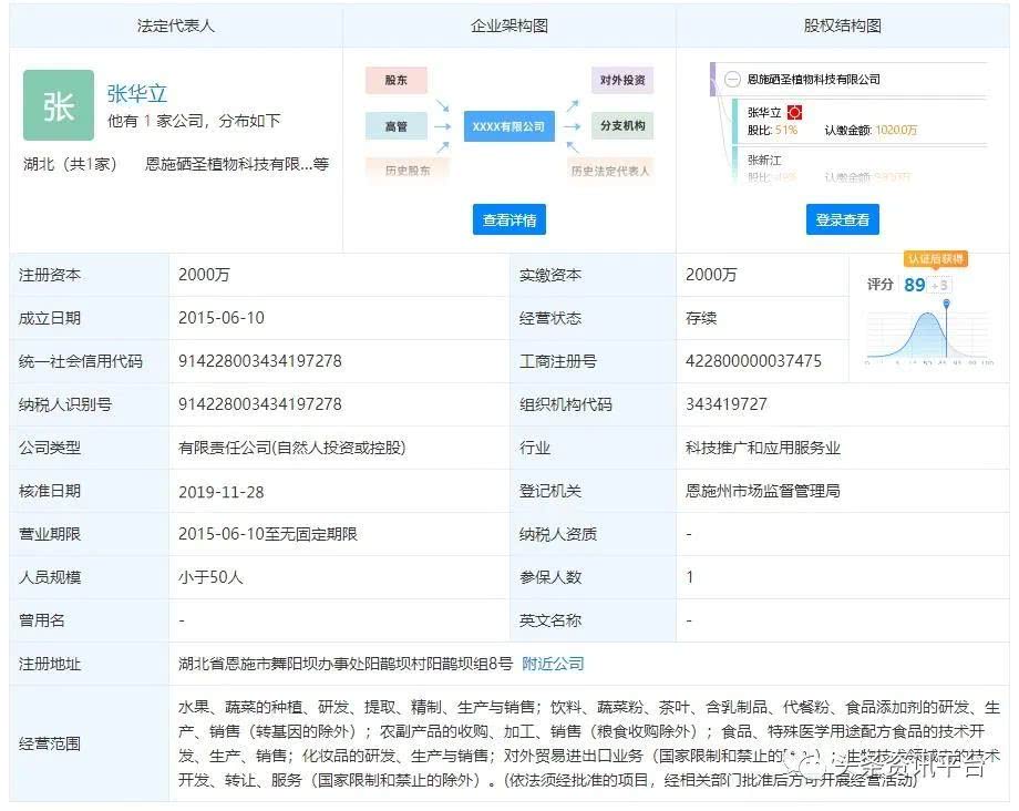 据了解,公司全名叫做恩施硒圣植物科技有限公司,于2015年6月10日成立,注册资金2000万元,实缴2000万元,法人代表张华立,执行董事张新江。