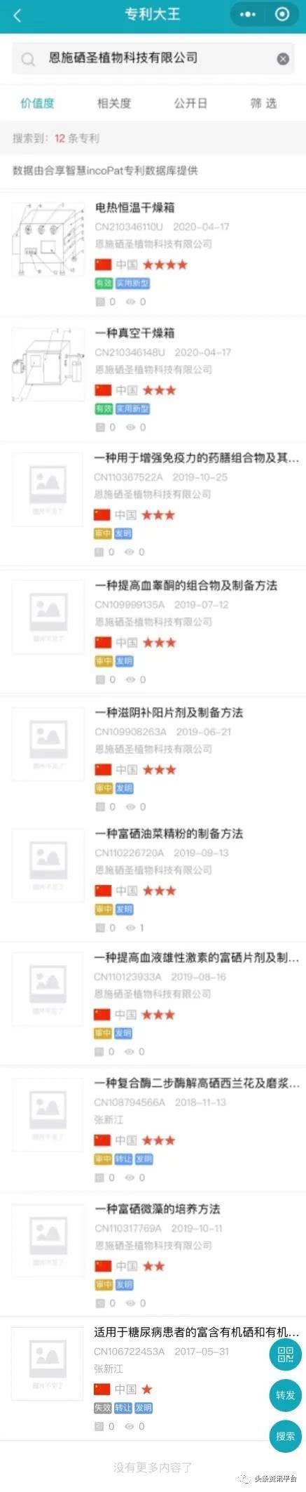 另外,经过查询我们了解到,公司的一系列专利只有电热恒温干燥箱和真空干燥箱设备有效,其余的尚处于审核状态,也就是暂未获得授权,并且对于这些专利的描述大部分都是培养富硒植物的内容,其中一个针对糖尿病患者的专利已经失效。
