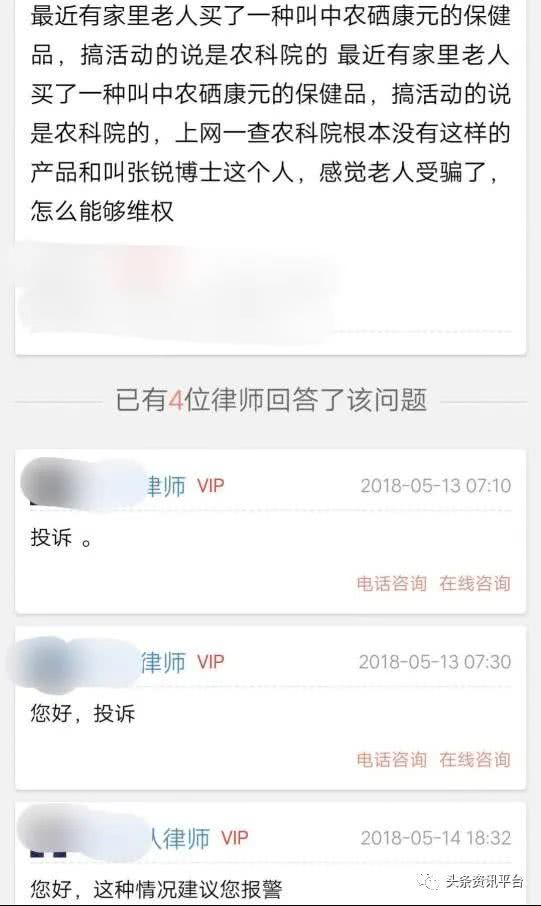 颇为值得注意的是,早在两年前,就有网友在“110法律咨询网”平台上留言,说家里老人买了这款产品,感觉上当受骗。对此,有四位律师在该网友的留言下表示受害人可以投诉或者报警处理。