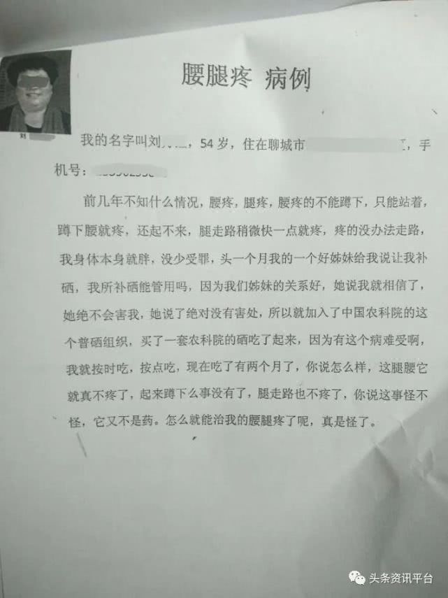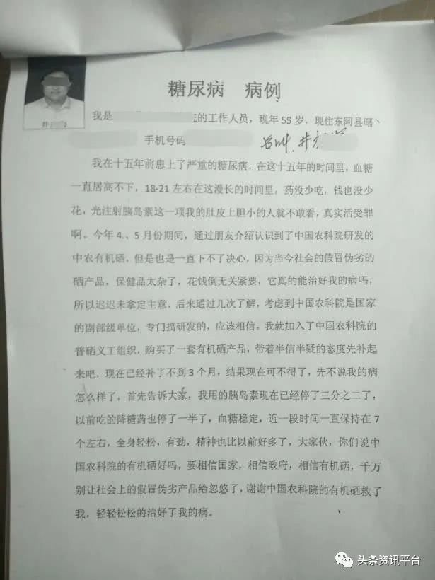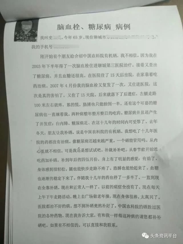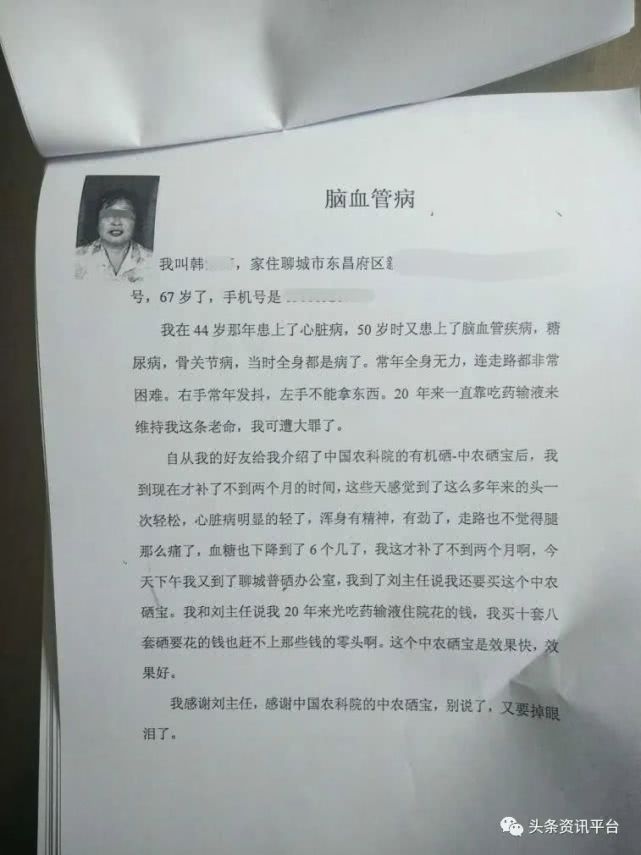 还有一位聊城市的韩女士,此人身患心脏病、脑血管病、糖尿病、骨关节病等多种病症,常年全身无力,走路困难,20多年来一直靠吃药输液来维持生命。之后通过好友介绍,她开始服用中农硒宝,过了不到两个月的时间,病症明显减轻。