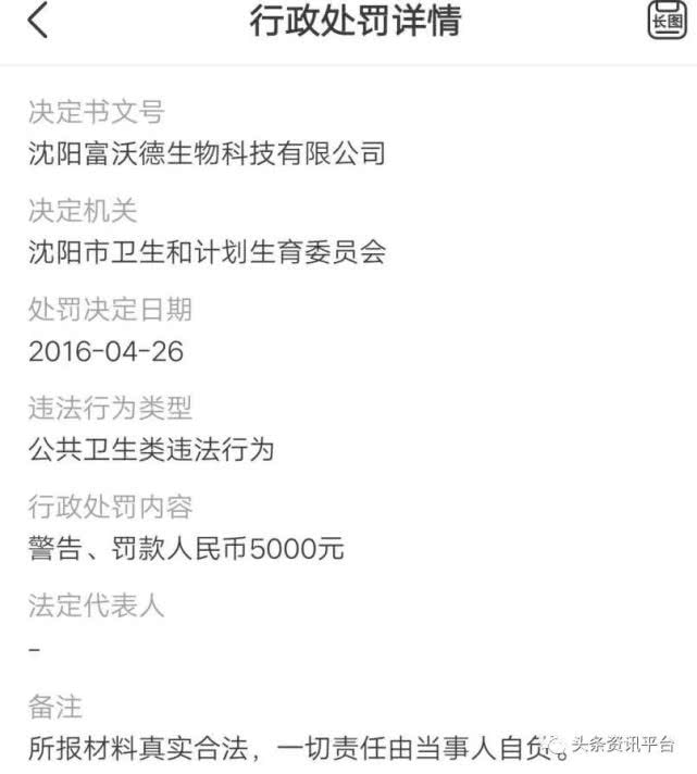 在2016年,该公司因公共卫生类违法行为被沈阳市卫生和计划生育委员会处以警告、罚款人民币5000元。