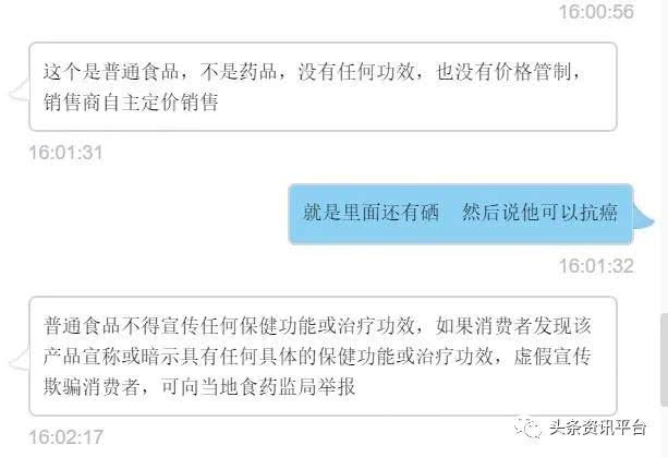 为此,我们也专门咨询了药品价格315网的专业药师,该药师在了解相关信息后也明确表示,该产品就是普通食品,不是药品,并没有任何功效。普通食品不得宣传任何保健功能或治疗功效,如果消费者发现该产品宣称或暗示具有任何具体的保健功能或治疗功效,虚假宣传欺骗消费者,可向当地食药监局举报。