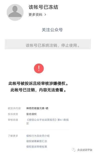 目前,我们在经销商的朋友圈中,看到的几篇关于补硒可以治病的文章的发布者账号不是被冻结,就是文章由于此账号被投诉并经审核涉嫌侵权而无法查看。