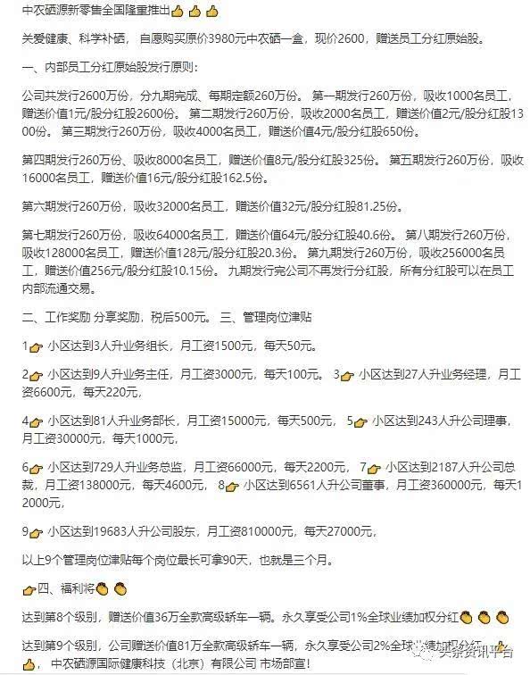 了解完中农硒源目前所实行的代理制度和内部分红股政策之后,我们将在下篇报道中继续剖析中农硒源的产品资质以及该公司在产品宣传方面所存在的问题,请继续关注头条资讯平台。