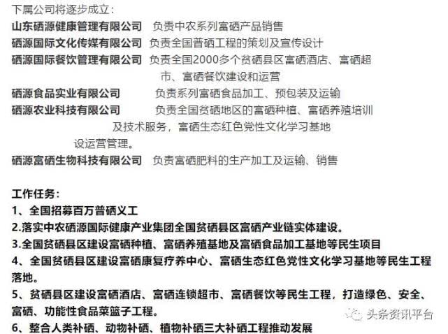 对外,中农硒源还宣称将逐步成立以下公司:山东硒源健康管理有限公司,负责中农系列富硒产品销售;硒源国际文化传媒有限公司,负责全国普硒工程的策划及宣传设计;硒源国际餐饮管理有限公司,负责全国2000多个贫硒县区富硒酒店、富硒超市、富硒餐饮建设和运营;硒源食品实业有限公司,负责系列富硒食品加工、预包装及运输;硒源农业科技有限公司,负责全国贫硒地区的富硒种植、富硒养殖培训及技术服务,富硒生态红色党性文化学习基地设运营管理;硒源富硒生物科技有限公司,负责富硒肥料的生产加工及运输、销售。