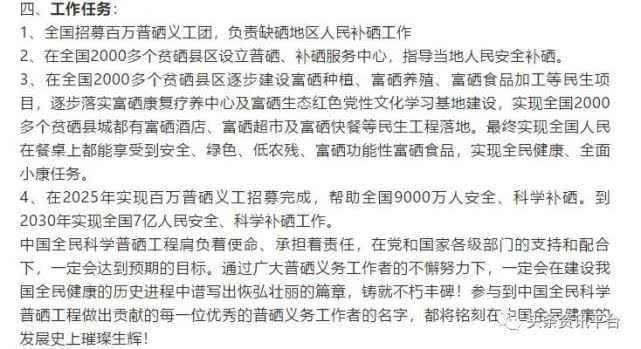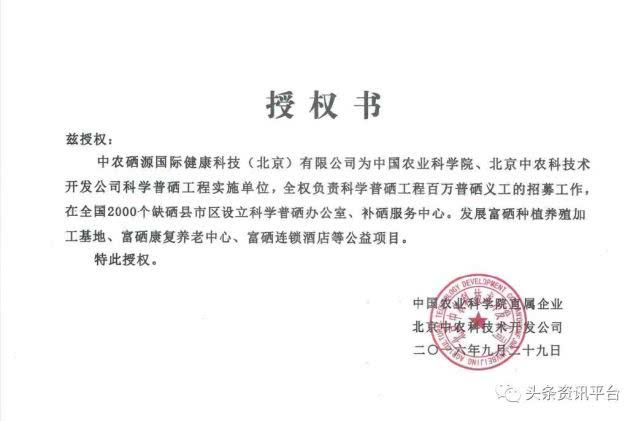 自2013年5月17日第一届全民补硒日开始,到今年,已经是第七个全民科学补硒日了。随着全国上下对补硒越来越重视,在2016年4月份时,中国农业科学院向国家工商总局申请成立“中农硒源国际健康科技(北京)有限公司”。最终,该公司获得批准,将负责全民科学普硒工程,并纳入中国农业科学院科研成果转化企业。由此,“全民普硒”工程落地生根,开枝散叶。