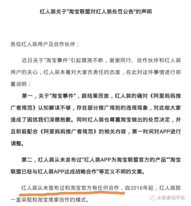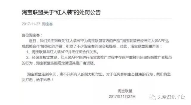 值得一提的是,红人装除了产品价格翻倍之外,笔者还发现早在2017年11月27日,淘宝就发声明称其与红人装无任何合作关系,彻底划清界限。之后红人装发布声明称自己之前从未宣布过和淘宝官方有任何合作。但在此之前我们可以在很多宣传文上看到红人装宣称是一家帮助淘宝、天猫、京东做导购的电商平台。