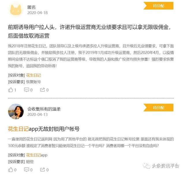 像这样的消费返利模式不只存在于红人装电商平台,花生日记也存在这样的返利模式,花生日记以会员费的名义向用户收取99元的人头费,并且建立了金字塔式的多层分销等级,在各大平台上的投诉不计其数,还因传销违法行为而遭到行政处罚。