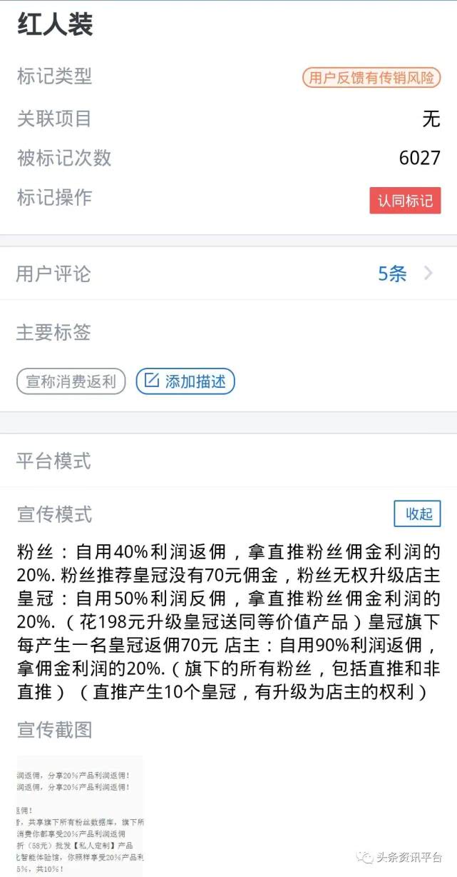 眼下,在腾讯灵鲲金融风险监管平台上,“红人装则”这个关键词已被标记了6027次,标记类型是“用户反馈有传销风险”。
