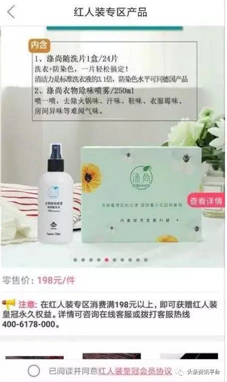 接下来再来看看红人装里面的产品如何。据消费者王女士透露,她加入红人装时购买了一款名为“涤尚水洗片”的产品,价格为198元,而淘宝同款产品价格为99.9元三盒,价格翻了6倍。花6倍多的钱去买产品并赚钱佣金,这个操作好像与红人装原本的“自用省钱,分享赚钱”的宣传语背道而驰。