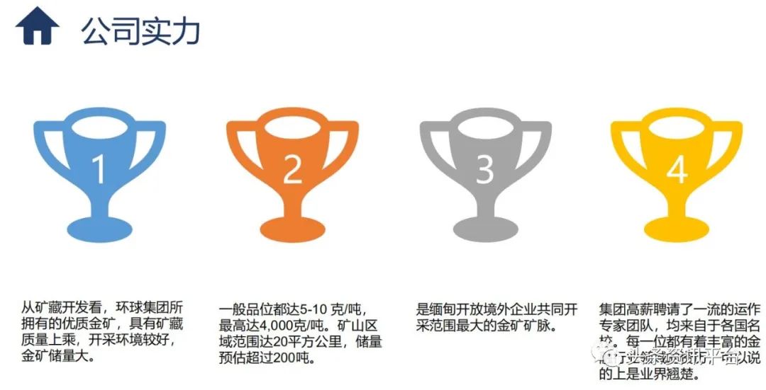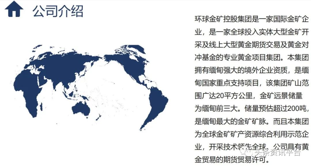 据官方介绍,该集团是一家国际金矿企业,是一家全球投入实体大型金矿开采以及线上大型黄金期货交易以及黄金对冲基金的专业黄金项目集团。该集团具有黄金开采和黄金期货交易权,同时向全球提供广泛的投资、咨询和金融服务,与此同时,该集团还声称在全球拥有大量的多行业客户,包括私营公司,金融企业,政府机构以及个人,拥有丰富的地区市场知识和国际运作能力。